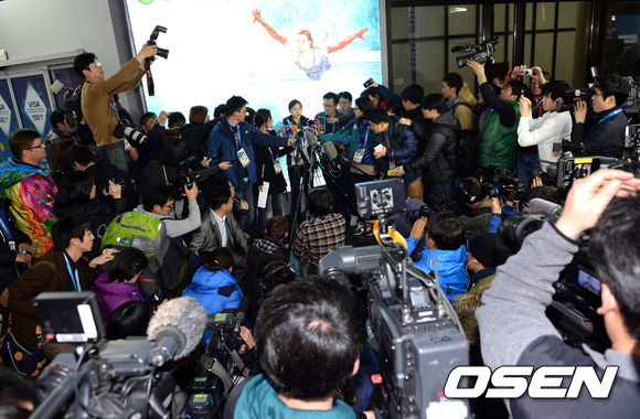 13일(한국시간) '피겨여왕' 김연아, 김해진, 박소연이 러시아 소치 아들레르 공항에 도착, 입국장을 나서며 취재진과 인터뷰를 하고 있다.
