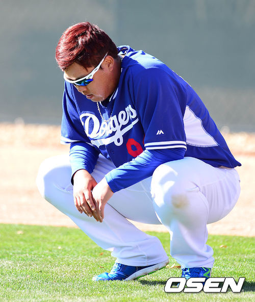 다저스 류현진이 러닝 훈련을 마치고 휴식을 취하고 있다.