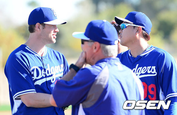 다저스 류현진이 훈련 중 클레이튼 커쇼와 이야기를 나누고 있다.