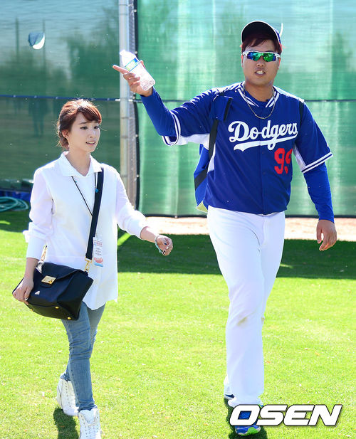 훈련을 마친 다저스 류현진이 MBC 스포츠 플러스 김선신 아나운서와 이야기를 나누고 있다.