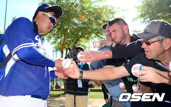 훈련을 마친 다저스 류현진이 팬들에게 사인을 해주고 있다.