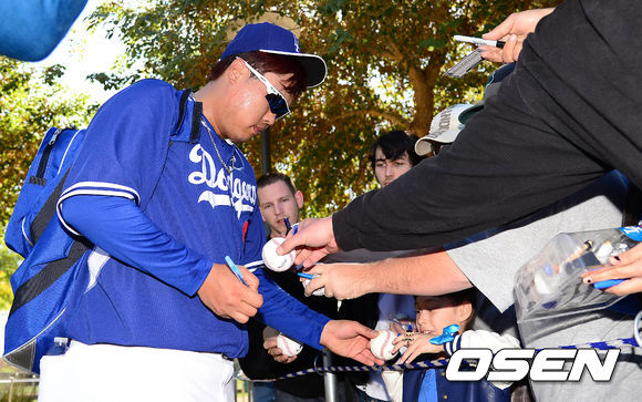 훈련을 마친 다저스 류현진이 팬들에게 사인을 해주고 있다.