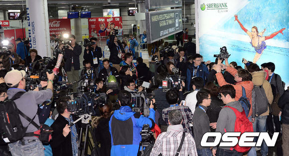 13일(한국시간) '피겨여왕' 김연아가 러시아 소치 아들레르 공항에 도착, 입국장을 나서며 인터뷰를 하고 있다.