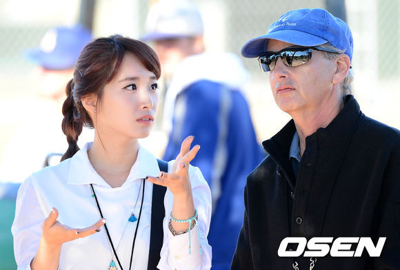 김선신 MBC 스포츠 플러스 아나운서가 켄 거닉 LA 다저스 담당기자와 이야기를 나누고 있다.