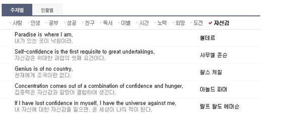 한 포털에 따르면 자신감 관련 명언에는 볼테르의 “내가 있는 곳이 낙원이라”가 있다. 스스로에 대한 믿음을 중시한 명언.