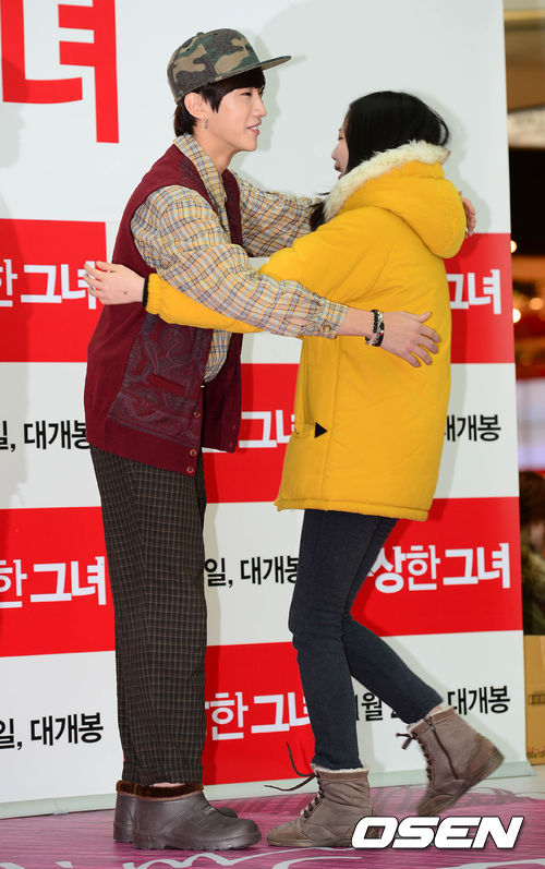 13일 오후 서울 영등포 타임스퀘어에서 열린 영화 '수상한 그녀' 500만 관객 기념 프리허그 행사에서 진영이 한 팬과 포옹을 하고 있다.
