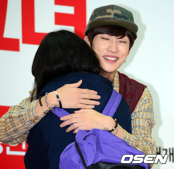 13일 오후 서울 영등포 타임스퀘어에서 열린 영화 '수상한 그녀' 500만 관객 기념 프리허그 행사에서 진영이 한 팬과 포옹을 하고 있다.