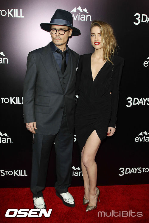 [OSEN/WENN 특약] 12일(현지시간) 미국 캘리포니아주 로스엔젤레스서 열린 영화 '쓰리 데이즈 투 킬 (3 Days to Kill)' 시사회에서 할리우드 스타 조니뎁과 그의 약혼녀이자 배우 엠버 허드가 함께 포즈를 취하고 있다.