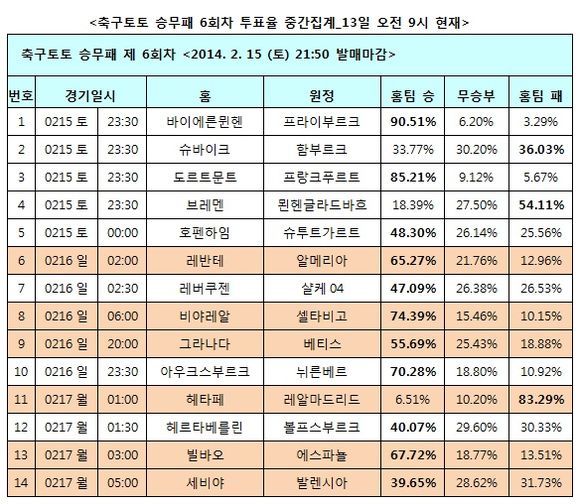 [축구토토] 국민체육진흥공단(www.kspo.or.kr)이 발행하는 체육진흥투표권 수탁사업자인 스포츠토토 온라인 공식 발매사이트 베트맨(www.betman.co.kr)은 오는 15일부터 17일까지 벌어지는 독일 분데스리가 8경기 및 스페인 프리메라리가 6경기 등 총 14경기를 대상으로 한 축구토토 승무패 6회차 투표율 중간집계 결과, 레버쿠젠-샬케04(7경기)전에서 국내 축구팬 47.09%는 레버쿠젠이 승리를 거둘 것으로 예상했다고 밝혔다.