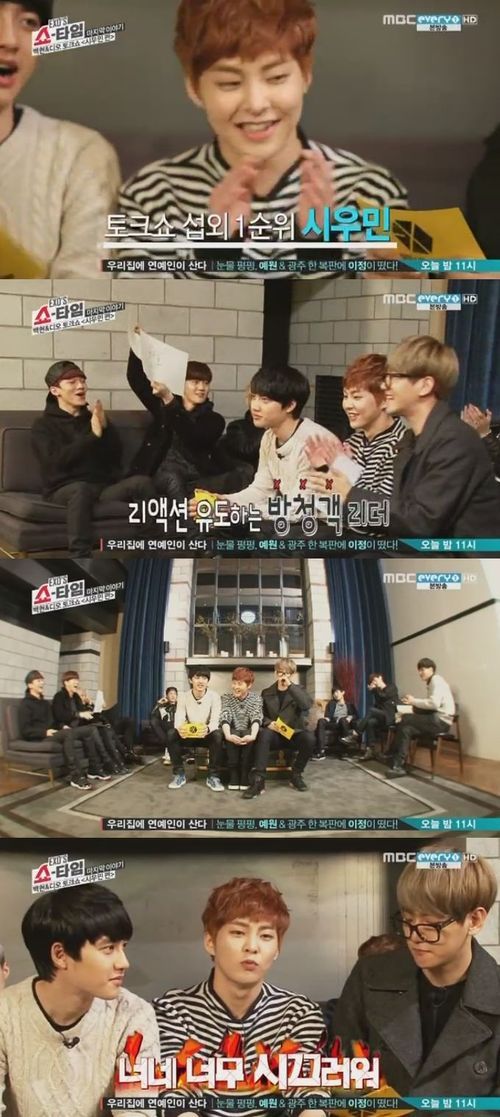 시우민은 13일 오후 방송된 케이블채널 MBC에브리원 '엑소의 쇼타임'에서 과묵한 자신을 돕기 위해 나선 백현과 디오로부터 여러가지 질문을 받으며 방송 울렁증을 떨쳐버리기 위해 노력했다.