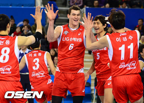 구미 LIG손해보험 그레이터스는 13일 대전 충무체육관에서 열린 NH농협 2013~2014 V리그 4라운드 경기에서 선두 대전 삼성화재 블루팡스에 3-1(25-22, 16-25, 25-23, 25-21)로 승리했다. 10승 13패, 승점 32점이 된 5위 LIG손해보험은 4위 대한항공에 승점 3점 차로 따라붙었다.