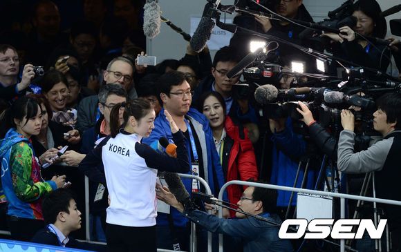 김연아가 13일(한국시간) 러시아 소치 스케이팅 트레이닝 센터에서 훈련을 마친 후 취재니과 인터뷰를 하고 있다.