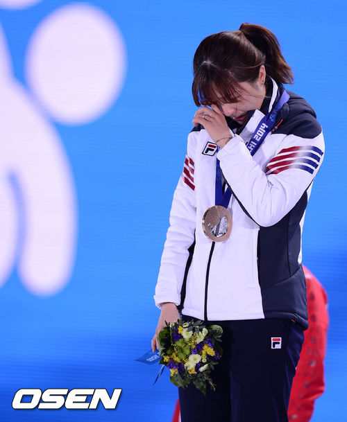 박승희가 14일(이하 한국시간) 러시아 소치 해안 클러스터 내 올림픽 파크 메달 프라자에서 열린 시상식에서 동메달을 수상하고 있다.