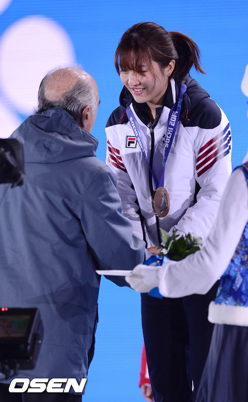 박승희가 14일(이하 한국시간) 러시아 소치 해안 클러스터 내 올림픽 파크 메달 프라자에서 열린 시상식에서 동메달을 수상하고 있다.