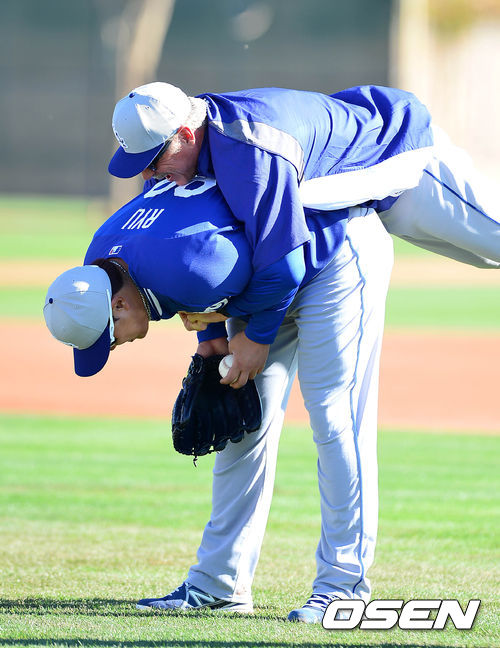 다저스 류현진이 훈련 중 코치와 장난을 치고 있다.
