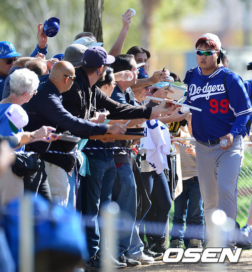 훈련을 마친 다저스 류현진이 팬들에게 사인을 해주고 있다.
