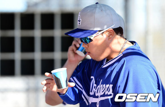 수비 훈련을 마친 다저스 류현진이 음료를 마시고 있다.