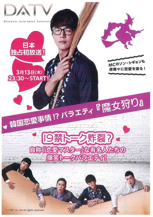 ‘마녀사냥’이 일본 유료 위성 방송 채널인 DATV에서 오는 3월 13일부터 매주 목요일 오후 11시 30분에 방송된다. DATV는 일본 한류 전문 방송 채널로 ‘마녀사냥’은 8회부터 일본어 자막으로 전파를 탄다.