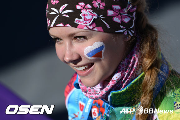 [OSEN=AFP 특약]13일(현지시간)러시아 소치 크로스 컨트리 라우라 크로스 컨트리 바이에슬론 센터에서 열린 2014 소치올림픽 여자 크로스 컨트리 10km 경기 때 한 러시아 여성팬이 페이스 페이팅 응원을 펼치고 있다.