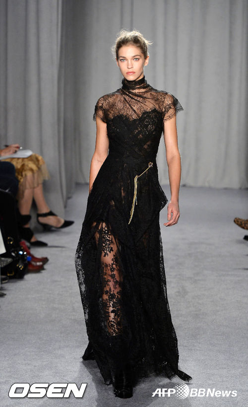 12일(현지시간) 미국 뉴욕에서 열린 '메르세데스 벤츠 뉴욕 패션위크 F/W 2014-마르케샤' 런웨이에서 한 모델이 캣 워크를 하고 있다.