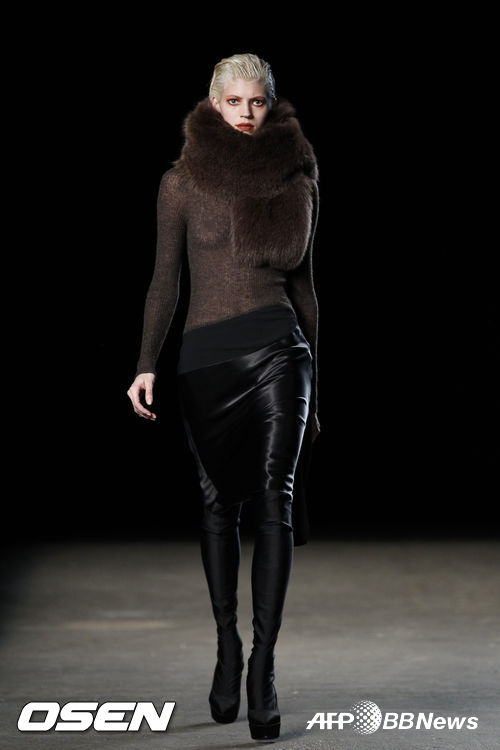 12일(현지시간) 미국 뉴욕에서 열린 '메르세데스 벤츠 뉴욕 패션위크 F/W 2014-나탈리 라타베시' 런웨이에서 한 모델이 캣 워크를 하고 있다.