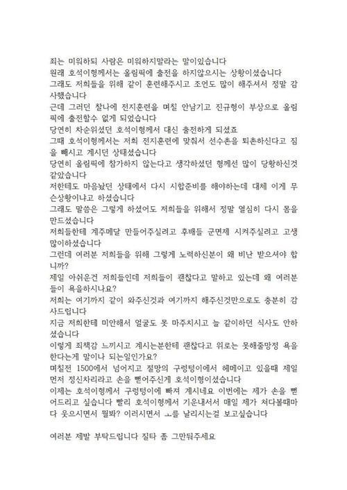 이어 신다운은 “며칠 전 1500m에서 넘어지고 절망의 구렁텅이에서 헤메이고 있을 때 제일 먼저 손을 뻗어주신게 호석이형”이라며 “여러분 제발 부탁드립니다. 질타 좀 그만둬주세요”라고 다시 한 번 간곡하게 부탁했다.