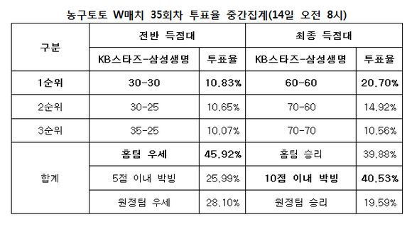 2013-2014시즌 농구토토 W매치 35회차 투표율 중간집계 결과…두 팀 10점차 이내 접전 예상