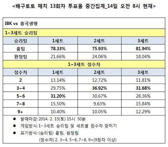 국민체육진흥공단(www.kspo.or.kr)이 발행하는 체육진흥투표권 수탁사업자인 스포츠토토의 공식 온라인 발매사이트 베트맨(www.betman.co.kr)은 오는 15일 열리는 2013-2014시즌 V-리그 IBK-흥국생명전을 대상으로 하는 배구토토 매치 13회차 게임 투표율 중간집계 결과, 배구팬들은 IBK가 흥국생명을 상대로 우세한 경기를 펼칠 것으로 예상했다.