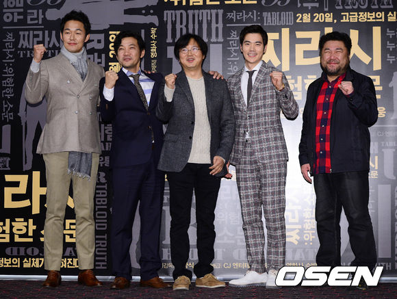 14일 오후 서울 행당동 CGV 왕십리에서 열린 영화 '찌라시:위험한 소문' 언론배급시사회에서 (왼쪽부터) 박성웅, 정진영, 김광식 감독, 김강우, 고창석이 포토타임을 갖고 있다.