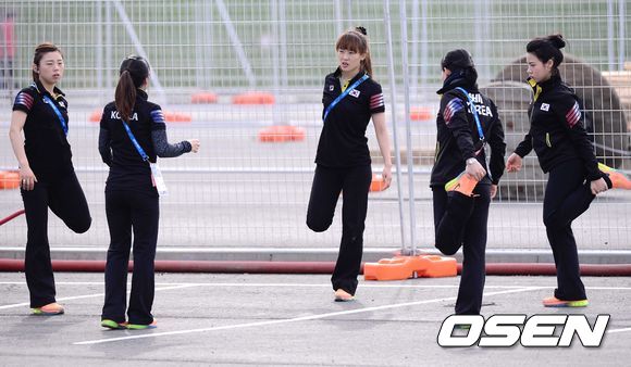 한국 여자 컬링대표팀이 14일 (이하 한국시간)러시아 소치 해안 클러스터 내 아이스큐브 커링센터에서 몸을 풀고 있다.