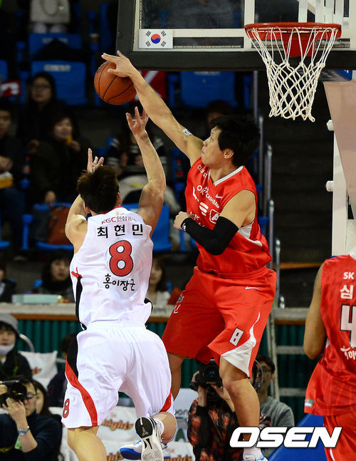 1쿼터 SK 박상오가 KGC 최현민을 슛블록하고 있다.