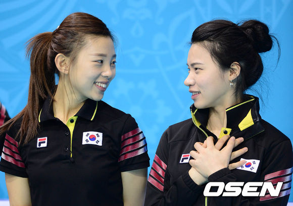 14일(한국시간) 러시아 소치 아이스큐브 컬링 센터에서 열린 여자컬링 예선전 한국과 중국과의 경기, 리드 이슬비(왼쪽)가 미소짓고 있다.