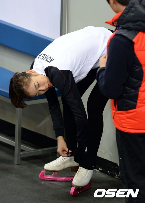 김연아가 14일(한국시간) 러시아 소치 해안클러스터 올림픽파크 피겨스케이팅 트레이닝 센터에서 훈련을 마친 후 스케이트 끈을 풀르고 있다.