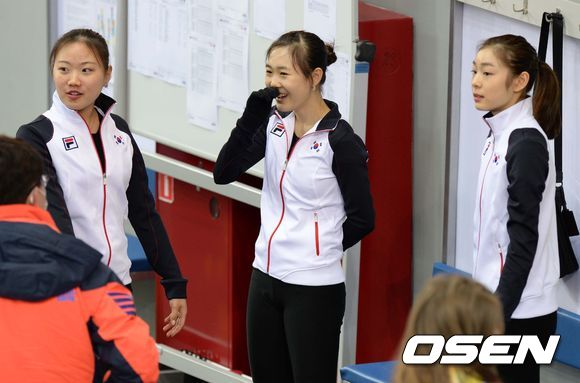 김연아가 14일(한국시간) 러시아 소치 해안클러스터 올림픽파크 피겨스케이팅 트레이닝 센터에서 김연아가 김해진 박소연과 얘기를 나누고 있다.