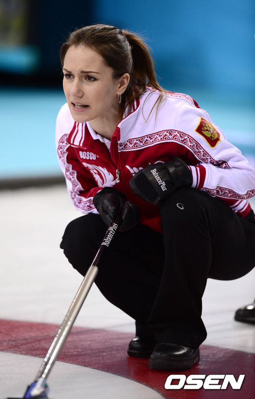 14일(한국시간) 러시아 소치 아이스큐브 컬링 센터에서 열린 여자컬링 예선전 러시아 대표팀이 경기에 임하고 있다.