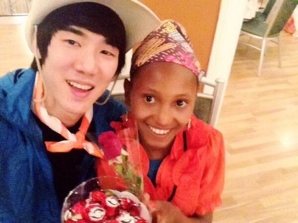 유연석은 15일 오전 자신의 트위터를 통해 "전 아프리카에서 생애 가장 특별한 밸런타인데이를 보내고 있어요. 에티오피아의 작은 학교에서 만난 츠께. 총리가 되고픈 너무나 예쁘고 큰 꿈을 가진 아이. 꽃 한 송이에 해맑게 웃어 보인다. 만나서 반가워 츠께"라는 글과 함께 사진 한 장을 게재했다.