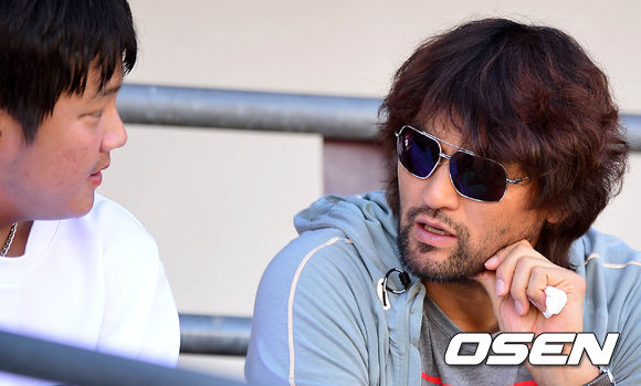 경기장을 찾은 박찬호가 NC 이민호와 이야기를 나누고 있다.