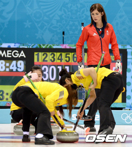 신미성(36)과 김지선(28) 이슬비(26) 김은지(25) 엄민지(23, 이상 경기도청)으로 구성된 여자 컬링대표팀(세계랭킹 10위)이 15일(이하 한국시간) 오후 러시아 소치 아이스큐브 컬링센터에서 영국과 6차전을 가졌다.
