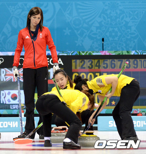 신미성(36)과 김지선(28) 이슬비(26) 김은지(25) 엄민지(23, 이상 경기도청)으로 구성된 여자 컬링대표팀(세계랭킹 10위)이 15일(이하 한국시간) 오후 러시아 소치 아이스큐브 컬링센터에서 영국과 6차전을 가졌다.