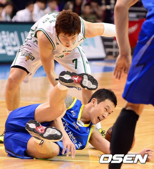15일 오후 서울 잠실실내체육관에서 열린 '2013-2014 KB국민카드 프로농구' 서울 삼성과 원주 동부의 경기 1쿼터 김승현과 두경민이 루즈볼 다툼을 하고 있다.