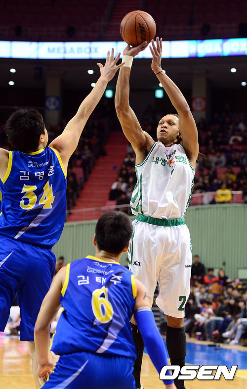 15일 오후 서울 잠실실내체육관에서 열린 '2013-2014 KB국민카드 프로농구' 서울 삼성과 원주 동부의 경기 1쿼터 렌들맨이 김명훈의 브로킹을 피해 슛을 시도하고 있다.