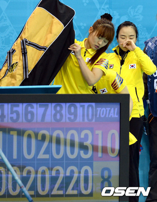 신미성(36)과 김지선(28) 이슬비(26) 김은지(25) 엄민지(23, 이상 경기도청)으로 구성된 여자 컬링대표팀(세계랭킹 10위)은 15일(이하 한국시간) 오후 러시아 소치의 아이스큐브 컬링센터에서 열린 컬링 라운드 로빈 세션 8 영국과 경기서 10엔드서 대거 3점을 내주면서 8-10으로 통한의 역전패를 당했다.