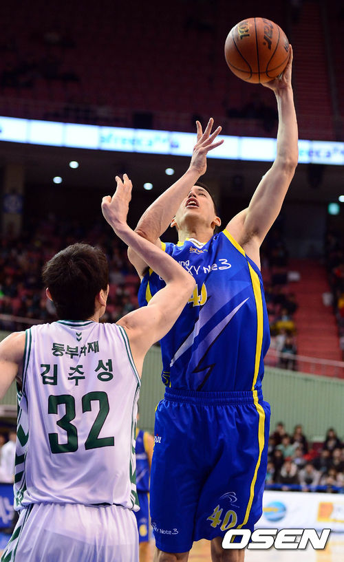 15일 오후 서울 잠실실내체육관에서 열린 '2013-2014 KB국민카드 프로농구' 서울 삼성과 원주 동부의 경기 4쿼터 이동준이 김주성을 피해 슛을 하고 있다.