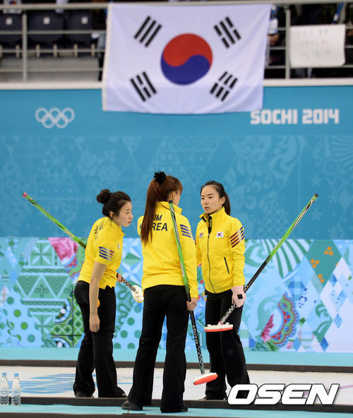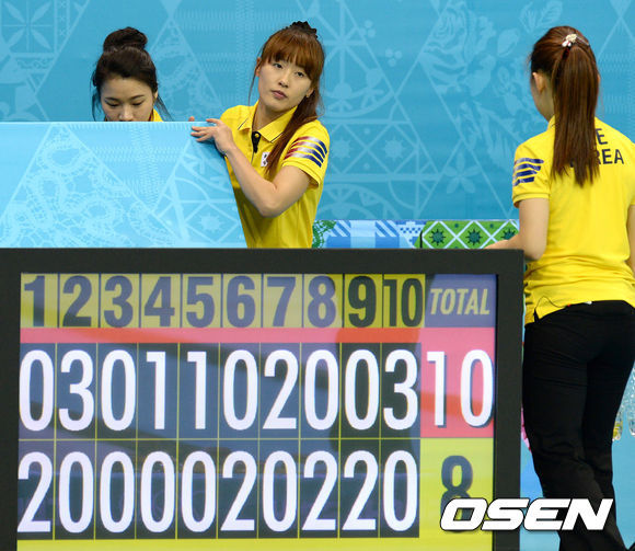신미성(36)과 김지선(28) 이슬비(26) 김은지(25) 엄민지(23, 이상 경기도청)으로 구성된 여자 컬링대표팀(세계랭킹 10위)은 15일(이하 한국시간) 오후 러시아 소치의 아이스큐브 컬링센터에서 열린 컬링 라운드 로빈 세션 8 영국과 경기서 마지막 10엔드 대거 3점을 허용하며 8-10으로 통한의 역전패를 당했다.