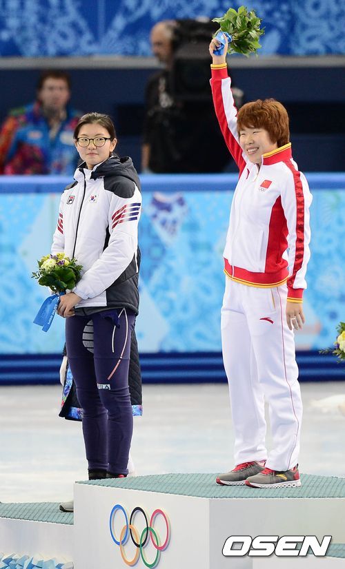 플라워 세레모니에서 심석희가 금메달 저우 양을 부러운 듯 바라보고 있다. /souls1011@osen.co.kr