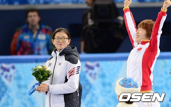 플라워 세레모니에서 심석희가 금메달 저우 양을 부러운 듯 바라보고 있다. /souls1011@osen.co.kr