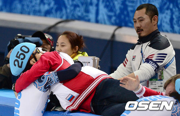 안현수가 금메달을 차지하고 코칭스태프와 포옹하는 모습을 최광복 코치가 바라보고 있다./ soul1014@osen.co.kr