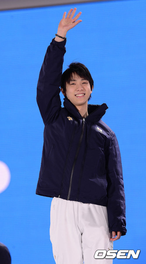 일본 피겨스케이팅 사상 최초로 올림픽 남자 싱글에서 금메달을 목에 건 하뉴 유즈루가 16일(이하 한국시간) 러시아 소치 해안 클러스터 내 올림픽 파크 메달 프라자에서 열린 시상식에서 손을 들어 인사하고 있다.