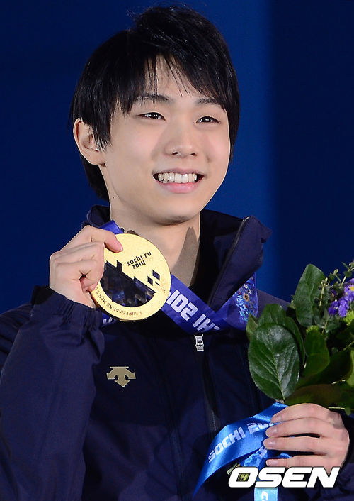 일본 피겨스케이팅 사상 최초로 올림픽 남자 싱글에서 금메달을 목에 건 하뉴 유즈루가 16일(이하 한국시간) 러시아 소치 해안 클러스터 내 올림픽 파크 메달 프라자에서 열린 시상식에서 금메달을 수상하고 있다.