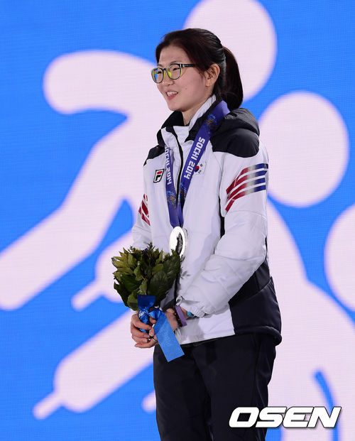 여자 쇼트트랙의 간판 심석희가 16일(이하 한국시간) 러시아 소치 해안 클러스터 내 올림픽 파크 메달 프라자에서 열린 시상식에서 은메달을 수상하고 있다.